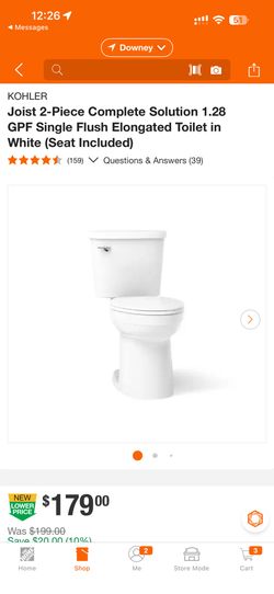 KOHLER Joist 2-Piece Complete Solution 1.28 GPF Single Flush Elongated Toilet in White (Seat Included)$120Bellflower, CA