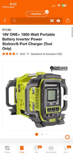 RYOBI 18V ONE+ 1800-Watt Portable Battery Inverter Power Station/8-Port Charger (Tool Only)$460Downey, CA