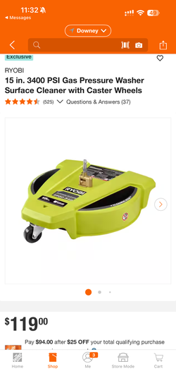 RYOBI 15 in. 3400 PSI Gas Pressure Washer Surface Cleaner with Caster Wheels$85Downey, CA