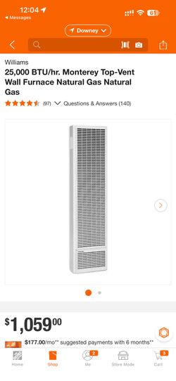 Williams 25,000 BTU/hr. Monterey Top-Vent Wall Furnace Natural Gas Natural Gas$750Downey, CA