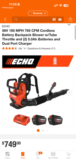 ECHO 56V 195 MPH 795 CFM Cordless Battery Backpack Blower w/Tube Throttle and (2) 5.0Ah Batteries and Dual Port Charger$530Downey, CA