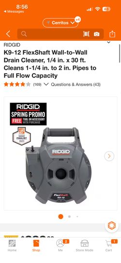 RIDGID K9-12 FlexShaft Wall-to-Wall Drain Cleaner, 1/4 in. x 30 ft. Cleans 1-1/4 in. to 2 in. Pipes to Full Flow Capacity$160Downey, CA