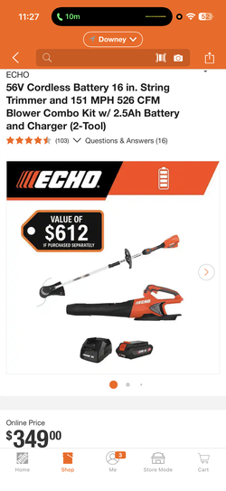 ECHO 56V Cordless Battery 16 in. String Trimmer and 151 MPH 526 CFM Blower Combo Kit w/ 2.5Ah Battery and Charger (2-Tool)$250Downey, CA