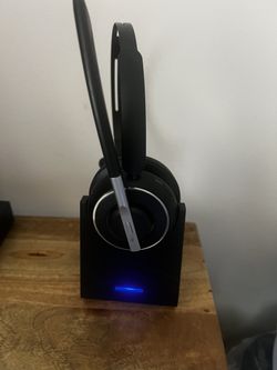 The image shows a PrancyBt Bluetooth Headset V5.2 Wireless AI Noise Cancelling KH120M with its charging base$45Miami, FL