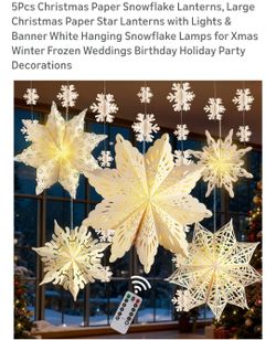 5Pcs Christmas Paper Snowflake Lanterns, Large Christmas Paper Star Lanterns with Lights & Banner White Hanging Snowflake Lamps for Xmas Winter Frozen$16Houston, TX