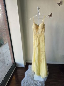 Yellow fitted lace and dress, it has beautiful floral appliques with small ringhstones, corset style on top, front slit / SIZE 4$95Hawthorne, CA