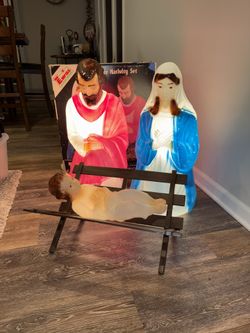 Vintage nativity set Mary Joseph Baby Jesus in manger lighted Christmas blow mold in box 4 piece 27“ w/ original paperwork Works great $250Glen Ellyn, IL