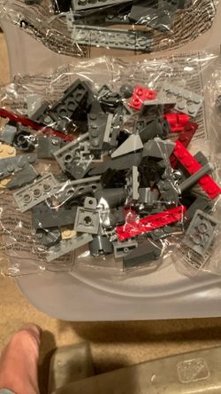 The image displays loose gray and red LEGO bricks, likely from a Star Wars set such as the LEGO Star Wars 7961 Darth Maul's Sith Infiltrator or 75104 $10San Pedro, CA