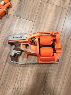 NERF Zombie Strike FlipFury Blaster Zombie Strike Flipfury blaster fires up to 12 darts without reloading Two flipping dart drums hold six darts a pie$50San Jose, CA