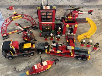 LIKE NEW!! EP EXERCISE N PLAY City Maritime FireFighting - Fire Station with slide, 2 helicopters, truck transport with large trailer, submarine, moto$15Orange, CA