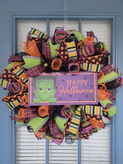Happy Halloween Wreath, Colorful Frankenstein Wreath, Whimsical Halloween Wreath $50Valrico, FL