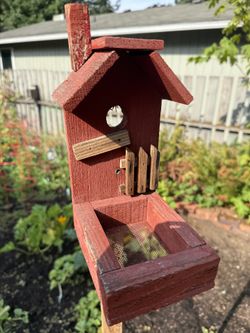 Tall wooden red Birdfeeder On Tall Post $20Tacoma, WA