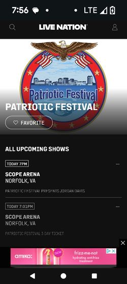 Patriotic Festival Pit Tickets Jordan Davis$85Virginia Beach, VA