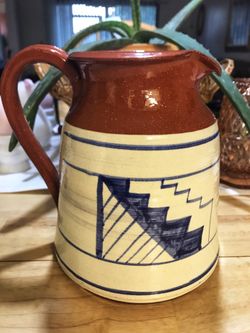 Madrid pottery- glazed clay pitcher with blue and white geometric pattern$16Deerfield Beach, FL