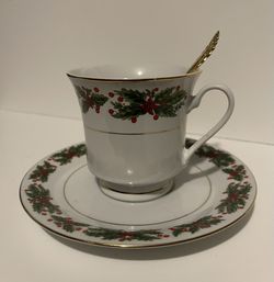 Truly Tasteful Tea Cup And saucer Christmas Holly Gold Teaspoon $5Herndon, VA