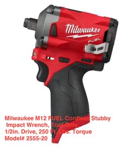 Milwaukee M12 FUEL Cordless Stubby Impact Wrench, Tool Only, 1/2in. Drive, 250 Ft./Lbs. Torque, Model# 2555-20$199Los Angeles, CA