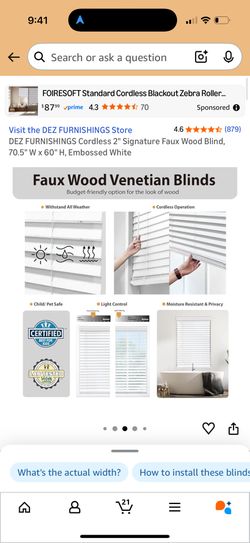 DEZ FURNISHINGS Cordless 2" Signature Faux Wood Blind, 70.5" W X 60" H, Embossed White$50Houston, TX