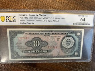 1963 Mexico 10 Pesos PCGS Choice UNC 64 Certified Banknote$60Portland, OR