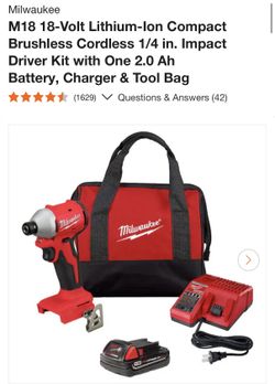 M18 18-Volt Lithium-Ion Compact Brushless Cordless 1/4 in. Impact Driver Kit with One 2.0 Ah Battery, Charger & Tool Bag$130Apple Valley, CA