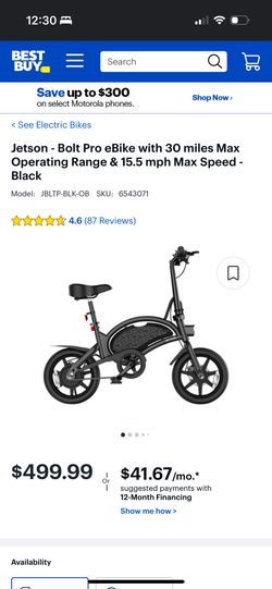 Jetson - Bolt Pro eBike with 30 miles Max Operating Range & 15.5 mph Max Speed - Black$250Houston, TX