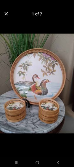 $18 Vintage Bamboo Wood Duck Themed Serving Tray and 6 Drink Coasters.Barware/Cabin Decor11"