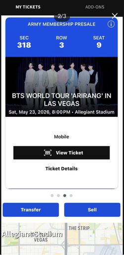 2x BTS Concert WORLD TOUR 'ARIRANG' IN LAS VEGAS Sat, March 23, 2026, 8:00 PM Allegiant Stadium Tickets$600San Diego, CA