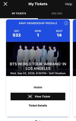 4x BTS Concert WORLD TOUR 'ARIRANG' IN LOS ANGELES Sunday, Sep 06, 2026, 8:00 PM SoFi Stadium Tickets$1,200Poway, CA