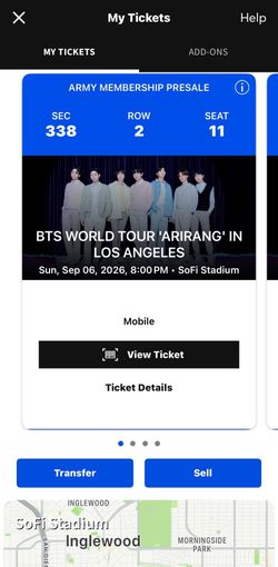 4x BTS WORLD TOUR 'ARIRANG' IN LOS ANGELES Sun, Sep 06, 2026, 8:00 PM • SoFi Stadium Concert Tickets$1,600Poway, CA