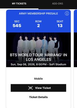 2x BTS Concert WORLD TOUR 'ARIRANG' IN LOS ANGELES Wed, Sep 02, 2026, 8:00 PM SoFi Stadium Tickets$550Poway, CA