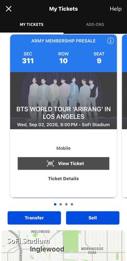4x BTS WORLD TOUR 'ARIRANG' IN LOS ANGELES Wed, Sep 02, 2026, 8:00 PM • SoFi Stadium Concert Tickets$1,500Poway, CA