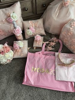 Pink Quince Crown, Doll, Pillows, Bible, Signature Book, Pink Moda 2000 gown, Duffle bag, Artificial Ramo, Gift Box, Champagne & 2 Glass Cups (Only us$500Perris, CA