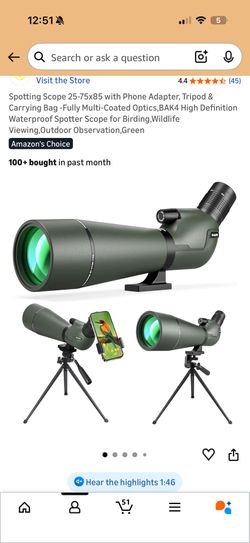 Spotting Scope 25-75x85 with Phone Adapter, Tripod & Carrying Bag -Fully Multi-Coated Optics,BAK4 High Definition Waterproof Spotter Scope for Birding$60El Monte, CA
