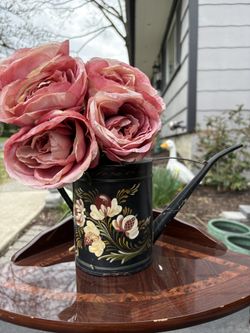 Vintage 1984 Tole Painted Black Metal Watering Can with Hand Painted Floral Design $30Yonkers, NY