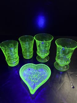 Vintage Vaseline Depression Uranium Green Glass Footed Tumblers Shot Glasses Heart Shaped Dish $75Yonkers, NY