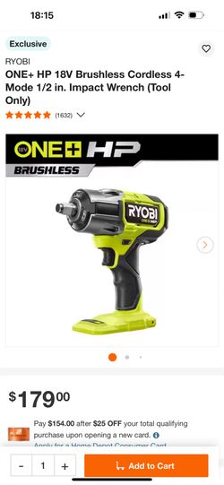 RYOBI - Llave de impacto ONE+ HP 18V sin escobillas inalámbrica de 4 modos de ½ pulgadas (solo herramienta)$110Miami, FL