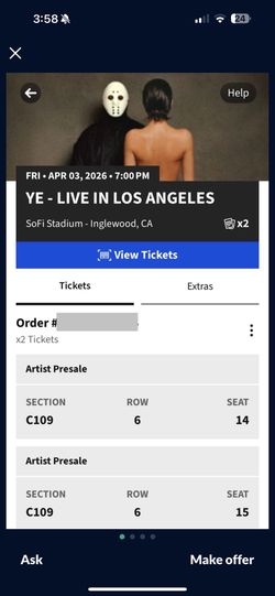Kanye 4/3 Amazing Seats $1,300Calabasas, CA