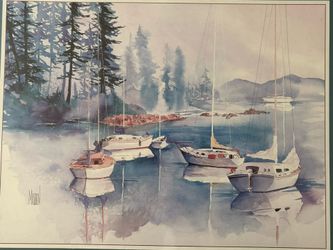 Madden Painting Ships Harbor Watercolor Boats Drawing Litho Framed Wood Matted $47Palm Harbor, FL