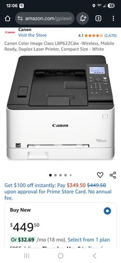 Canon Color Image Class LBP622Cdw -Wireless, Mobile Ready, Duplex Laser Printer, Compact Size - White$225Tigard, OR