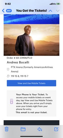 Andrea Bocelli 12/18/21 Miami - 2 tickets $525Boca Raton, FL