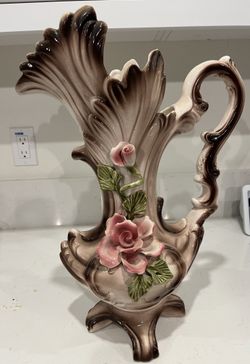 Vintage Capodimonte Italy 18” Porcelain Ewer Vase Applied Pink Roses Crown N Shell Form$80Corona, CA