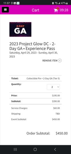 2 Project Glow Tickets DJ Tiesto $330Rockville, MD