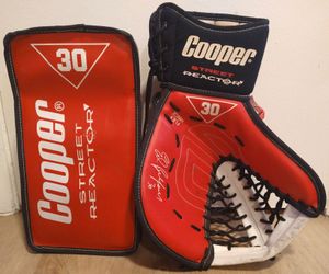 EDDIE THE EAGLE BELFOUR COOPER STREET REACTOR HOCKEY GOALIE MATCHING BLOCKER & CATCHER!!! RARE! MINTY CONDITION! DON'T MISS OUT! ๐ฆ