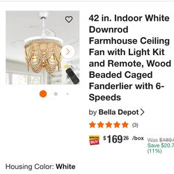 42 in. Indoor White Downrod Farmhouse Ceiling Fan with Light Kit and Remote, Wood Beaded Caged Fanderlier with 6-Speeds$30Nashville, IN
