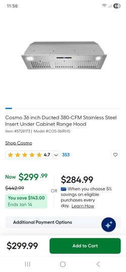 Cosmo 36 inch Ducted 380-CFM Stainless Steel Insert Under Cabinet Range Hood$30Nineveh, IN