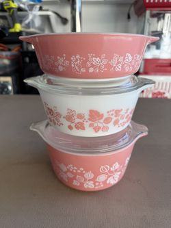 Vintage Pyrex Set of 3 Small Pink Gooseberry Casserole Dishes w LIds 471 472 473$250Orange, CA