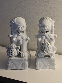 Medium Size Pair of Spectacular All White Vintage/Antique Foo Dogs. Made of high-quality porcelain, showcasing intricate details and a smooth white $420Miami, FL