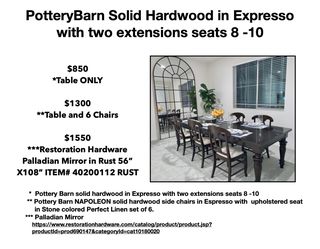 PotteryBarn solid hardwood in Expresso table with two extensions seats 8 -10$1,300Corona, CA