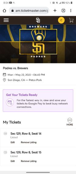 5/23 Padres vs Brewers (2) Tickets Section 129, Row 8$40San Diego, CA