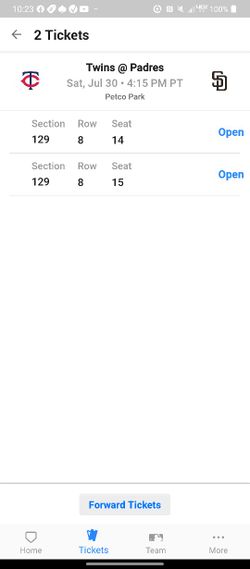 7/30 2 Tickets Padres v Twins. Section 129, Row 8$35San Diego, CA