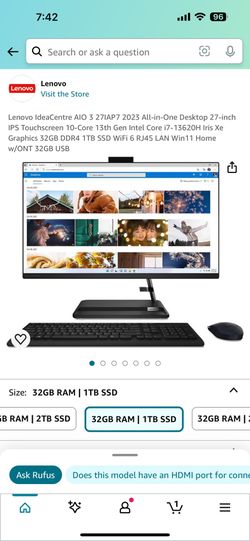 Lenovo IdeaCentre AIO 3 27IAP7 2023 All-in-One Desktop 27-inch IPS Touchscreen 10-Core 13th Gen Intel Core i7-13620H $800Turlock, CA